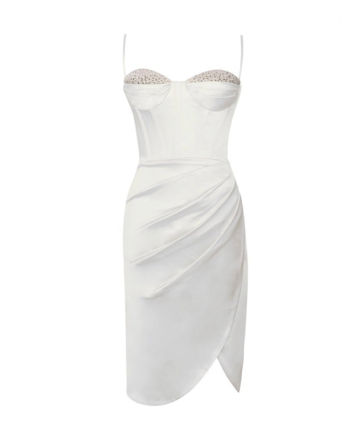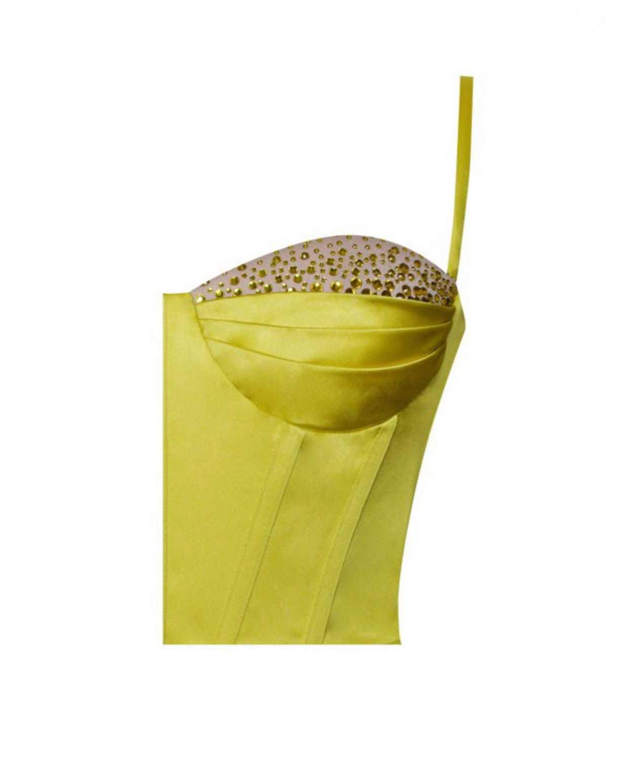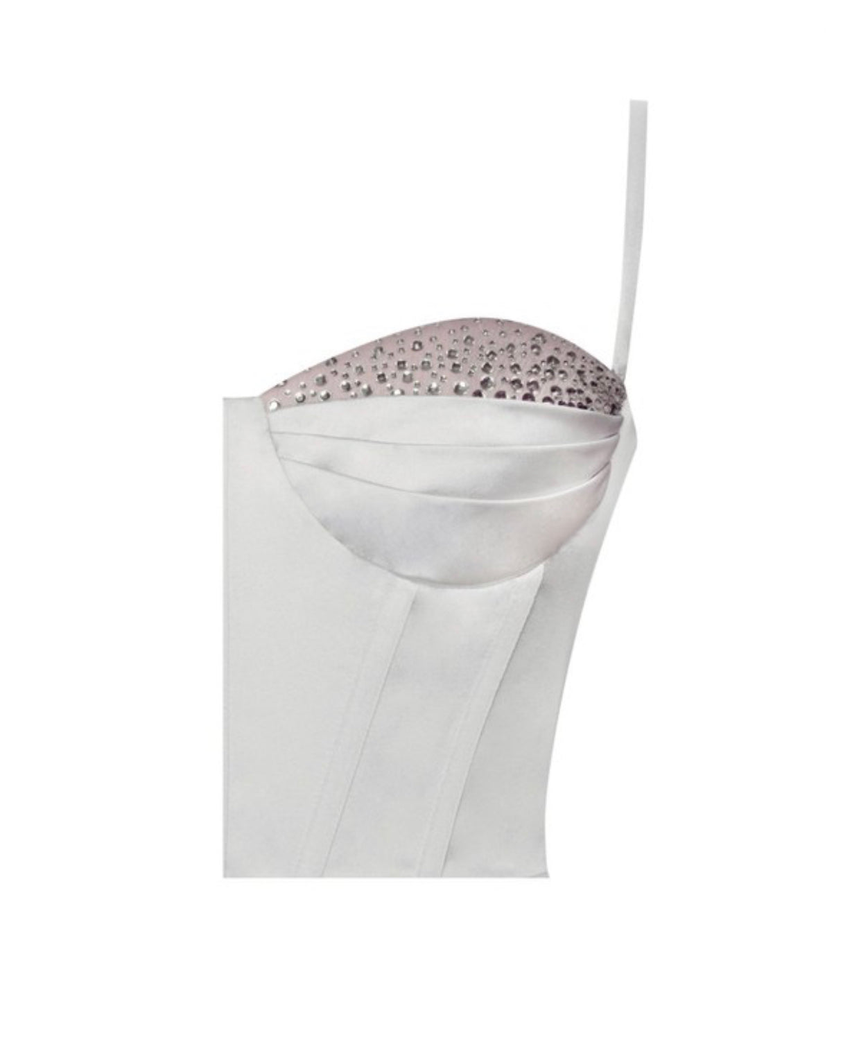 Sophisticated, dazzling, and unique. Satin dress that features a corset bustier with hand-placed crystals along the bust that creates a form-fitting silhouette. With adjustable straps.