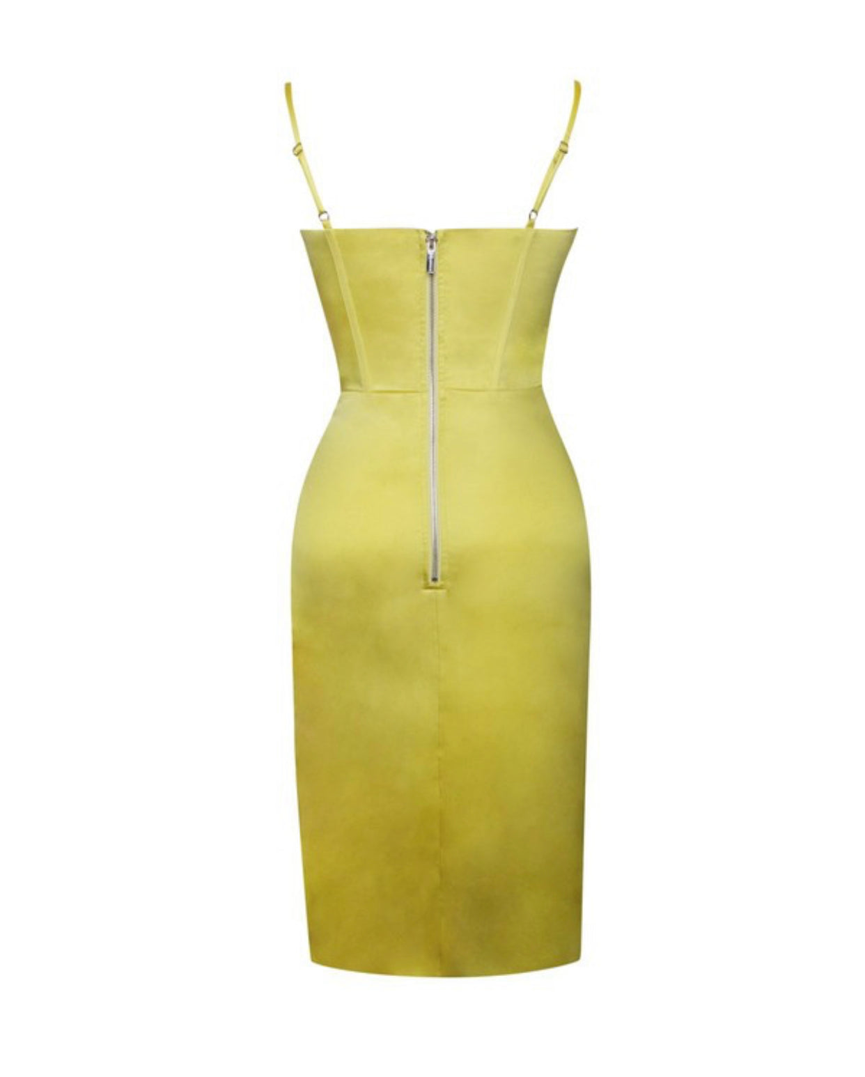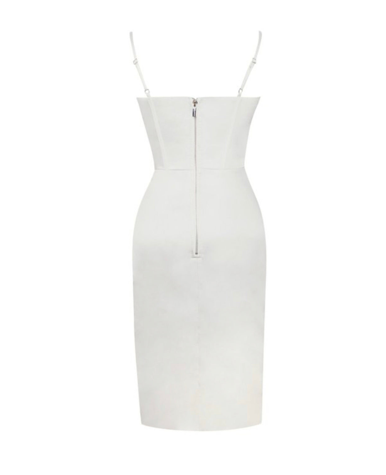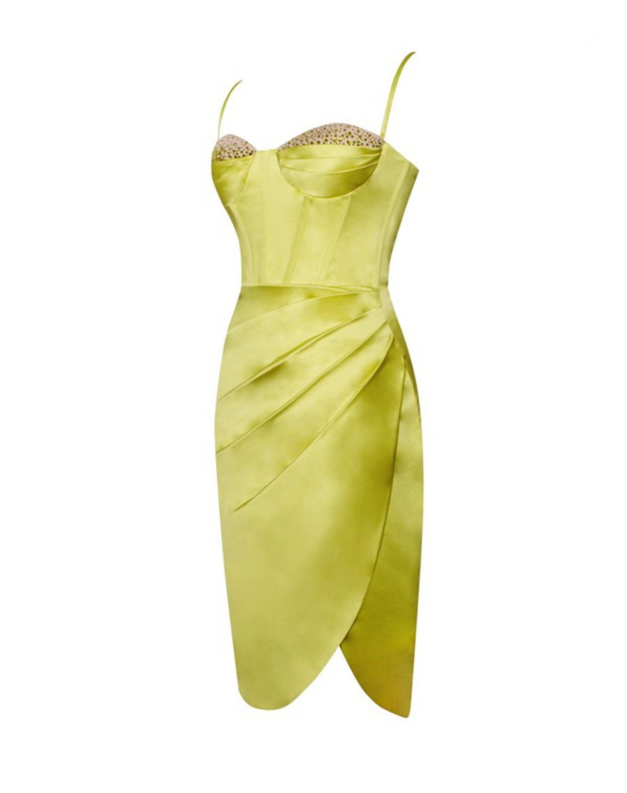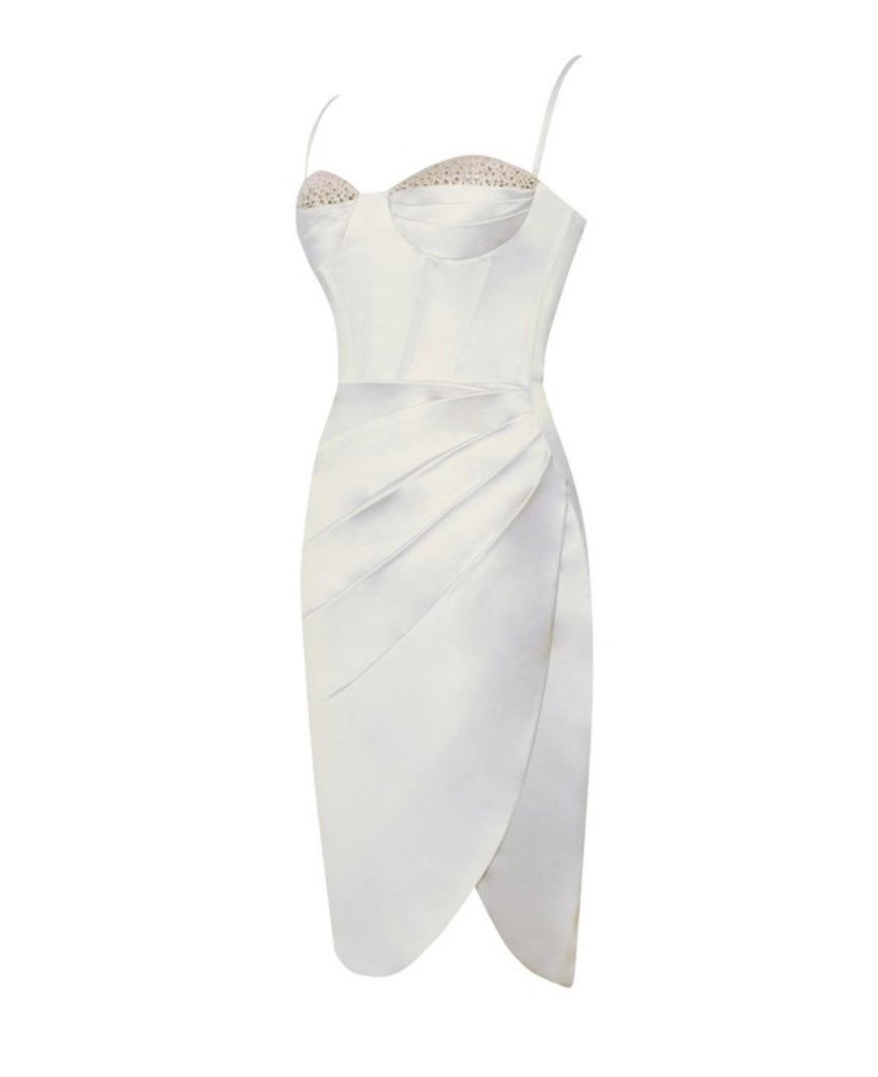 Sophisticated, dazzling, and unique. Satin dress that features a corset bustier with hand-placed crystals along the bust that creates a form-fitting silhouette. With adjustable straps.