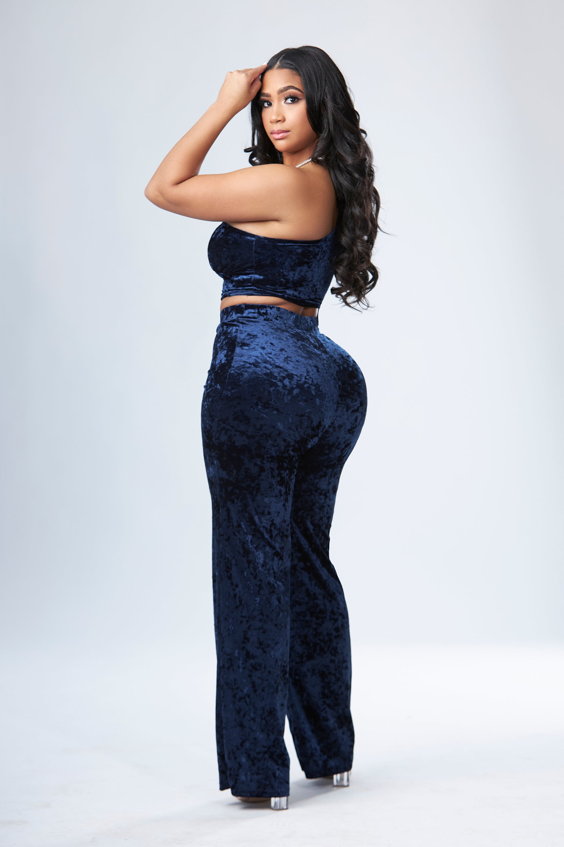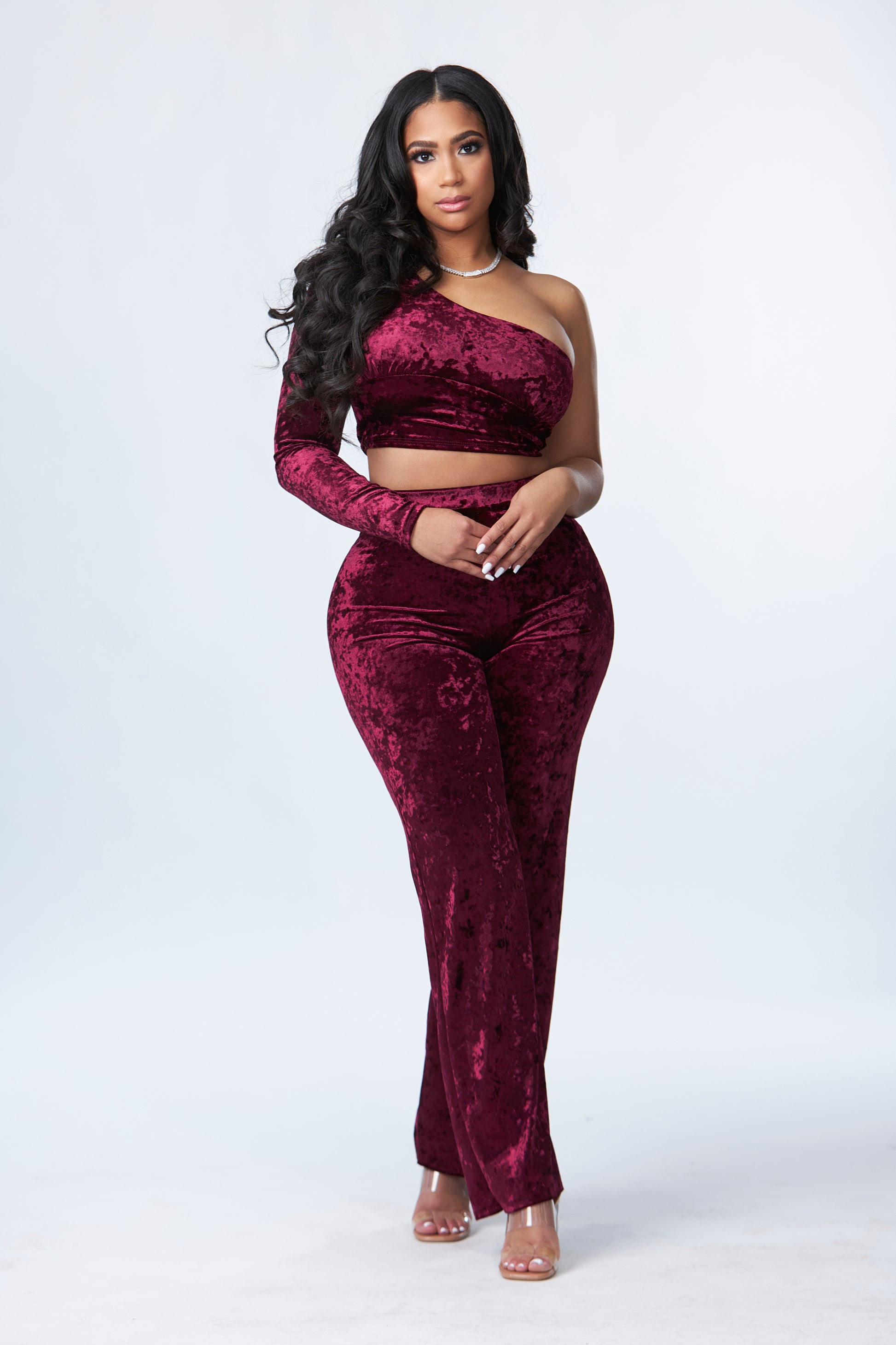 'Mistress' is our crushed velvet set. Featuring a long sleeve one-shoulder crop top, puff long sleeve detail, one-shoulder detail, underbust gather detail, fully lined front top, and medium stretch for comfort. The pants are high-waisted wide-leg pants, double-faced waistband, and full length.