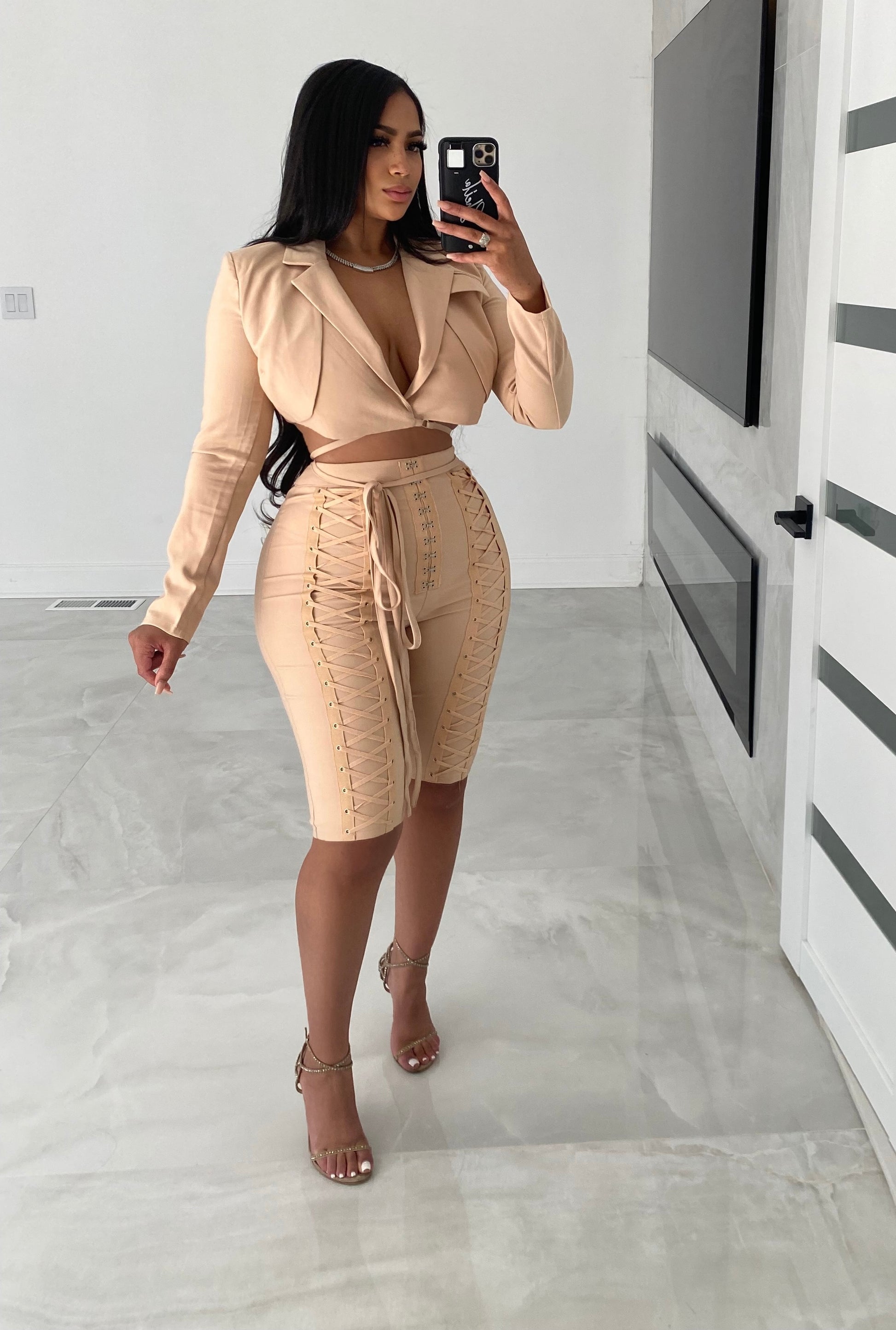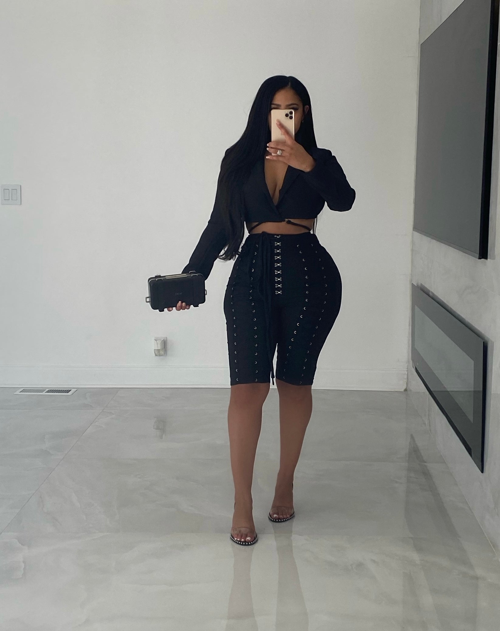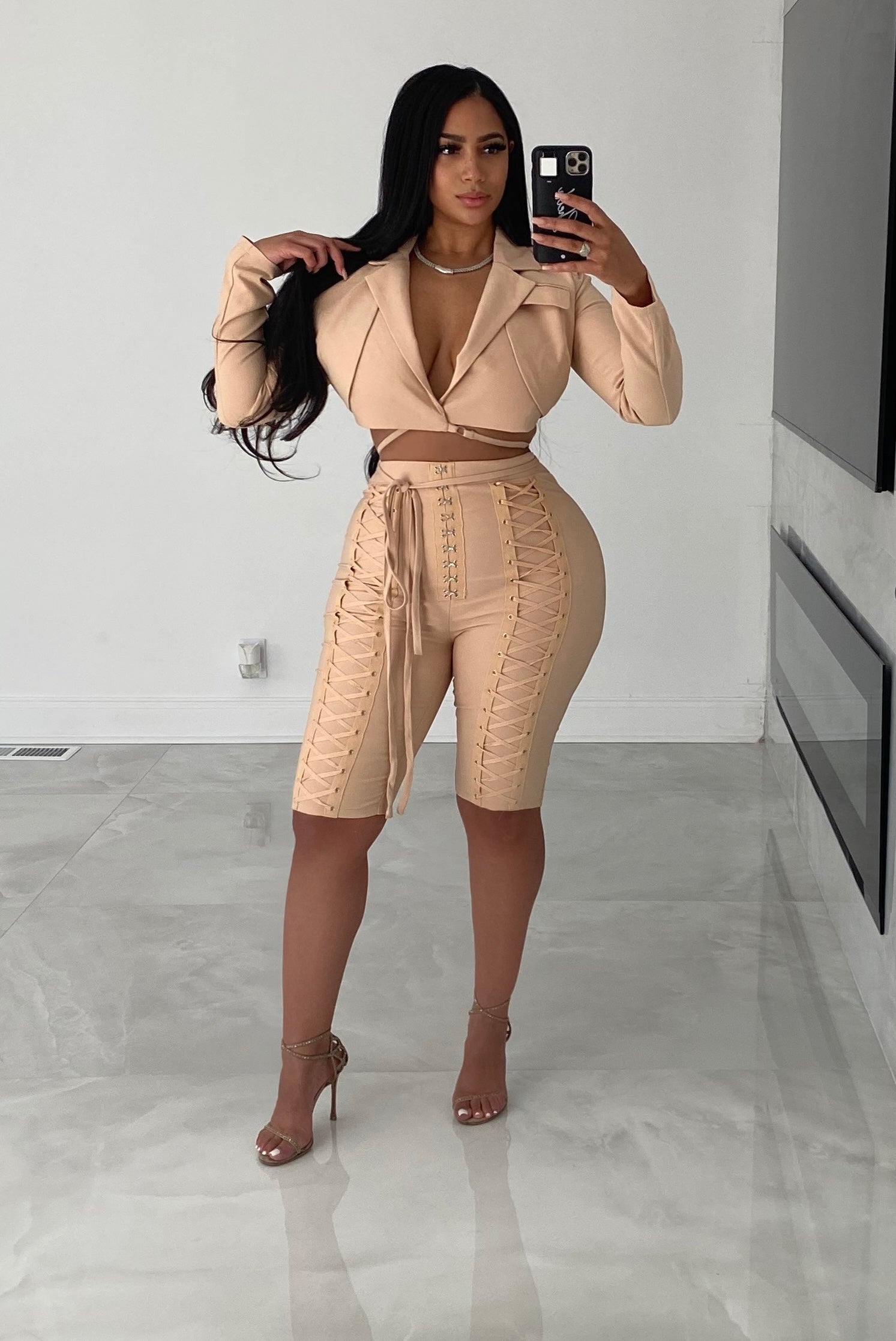 ‘Entanglement’ is our blazer and biker short set. Featuring a notched, lapel collar, rounded storm flap front detail, wrap around waist tie, shoulder pads, high waist biker short fit (fully lined), lace up with nonfunctional hook + eye detail and zipper back closure.