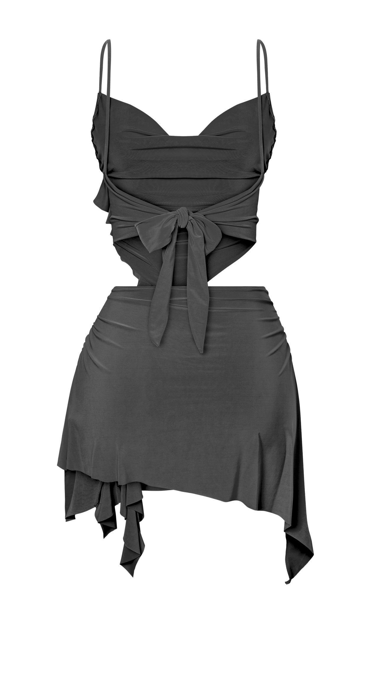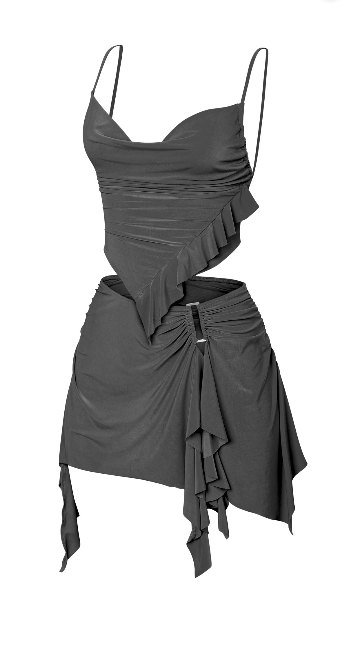 The top of this set boasts an alluring open back design, adding a touch of allure and intrigue to your look. The back self-tie feature allows you to customize the fit and adds a charming detail. The ruffled asymmetrical hem brings a flirty and feminine touch, creating beautiful movement and adding dimension to the ensemble.
