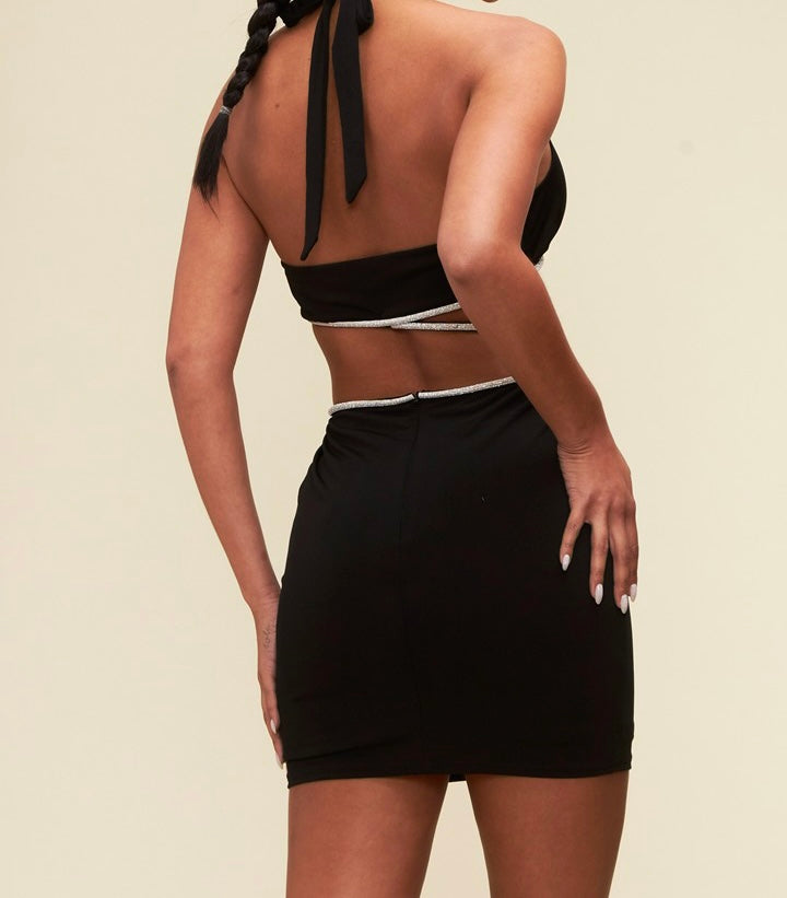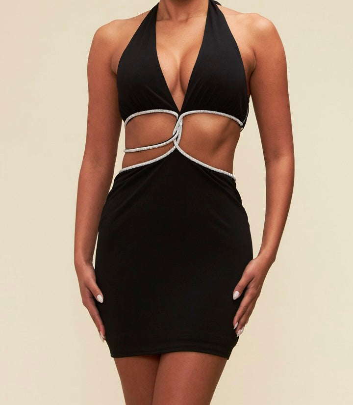 This dress is a captivating combination of glamour and allure. Designed with intricate crystal detailing, it adds a touch of sparkle and elegance to your ensemble. The halter top style enhances your shoulders and neckline, creating a flattering and feminine look. The standout feature of this dress is the daring design that showcases your stomach, allowing you to make a bold fashion statement. The crystal accents draw attention to this area, creating a mesmerizing focal point. With its unique and eye-catching design, this dress is perfect for special occasions or events where you want to stand out and make a lasting impression. It exudes confidence and sophistication, making you the center of attention wherever you go.