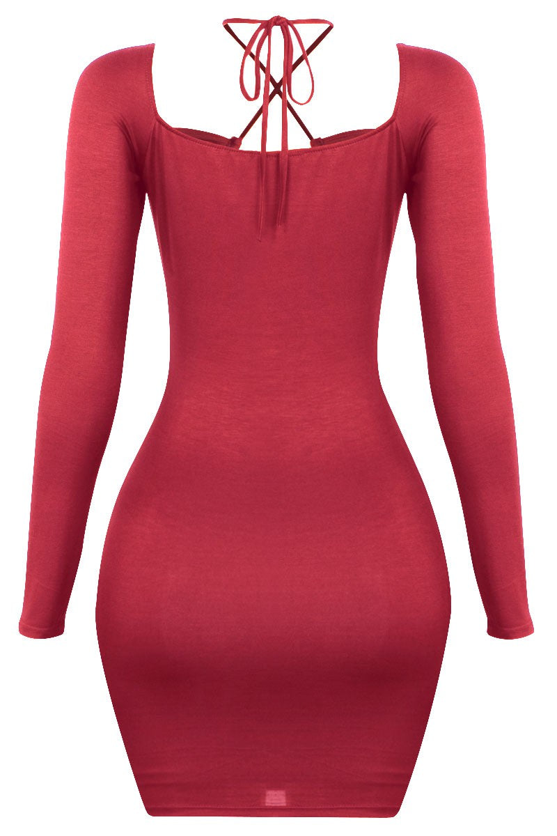This stunning dress embodies contemporary glamour and bold style. With its long sleeves and square neckline, it exudes an air of sophistication. The standout feature is the criss-cross halter front, creating an eye-catching detail that adds a touch of intrigue to the dress. A daring front cut-out further enhances its allure, revealing just the right amount of skin. The dress has a mini length, perfect for showcasing your legs and exuding youthful energy. It is crafted with a double-layered design, which not only adds depth but also ensures a smooth and flattering fit. Made from a stretchy fabric, it offers both comfort and flexibility, allowing you to move with ease. This dress is a captivating blend of elegance, contemporary design, and a hint of allure, making it an ideal choice for special occasions or nights out.