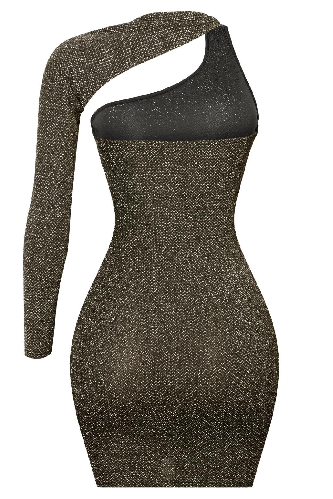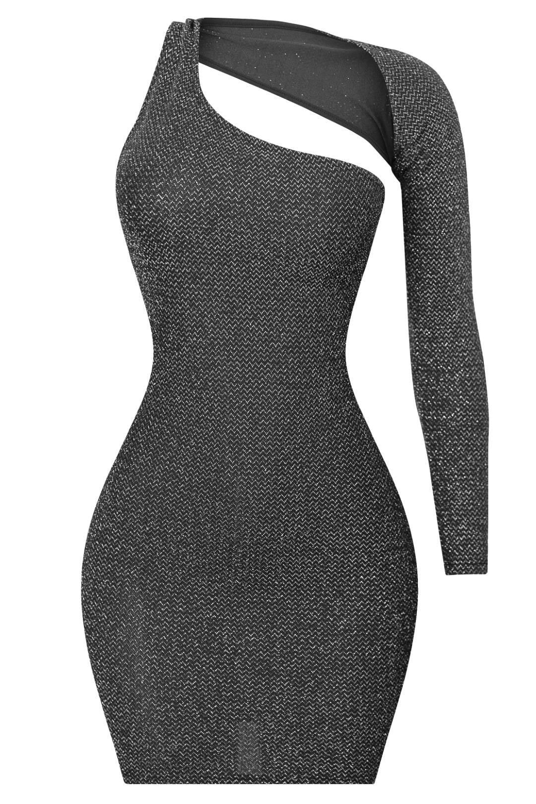 The dress is a stunning blend of modern elegance and daring style. Crafted from a stretchy and shiny metallic fabric, it catches the light and exudes a glamorous charm. The asymmetrical long sleeve design adds a unique touch, with one sleeve extending gracefully to the wrist, while the other side showcases an alluring one-shoulder style, leaving the opposite shoulder bare. The mini fit accentuates your figure, hugging your curves with its tailored silhouette. This dress is a bold statement piece that effortlessly combines fashion-forward details with a touch of allure.