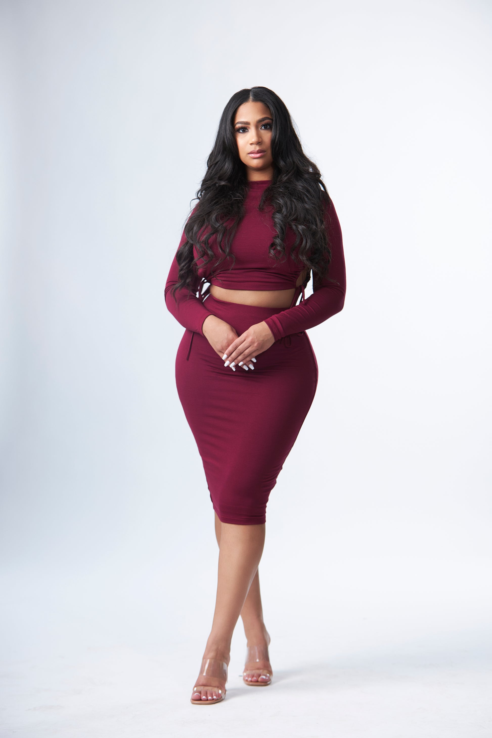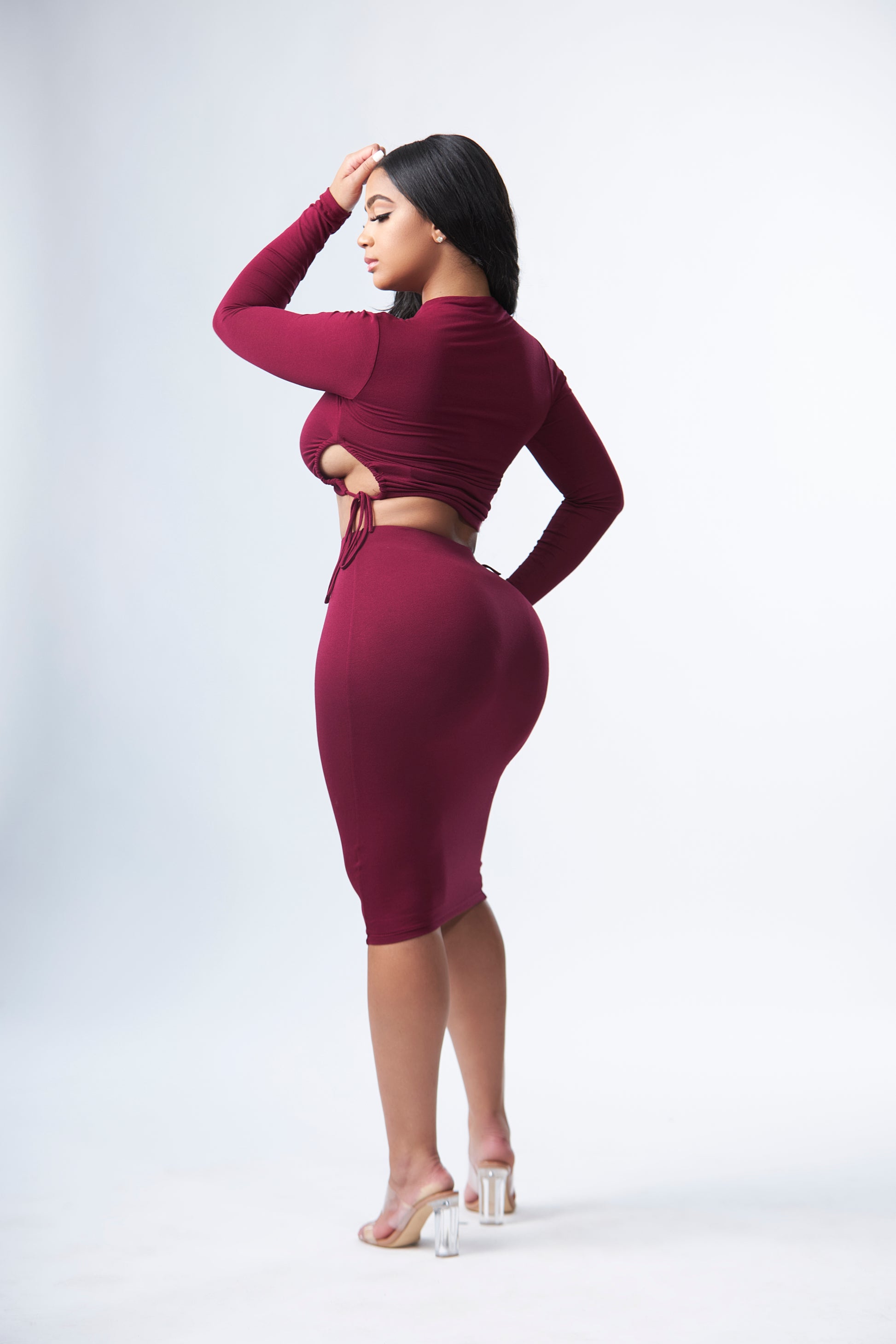 ‘Sophisticated’ is our high neck long sleeve side ruched tee & high-waisted midi skirt set. Featuring a high neck top, long sleeve, side ruching detail with adjustable tie, fully double-faced top & skirt, high waisted, knee-length skirt, and medium stretch for comfort.
