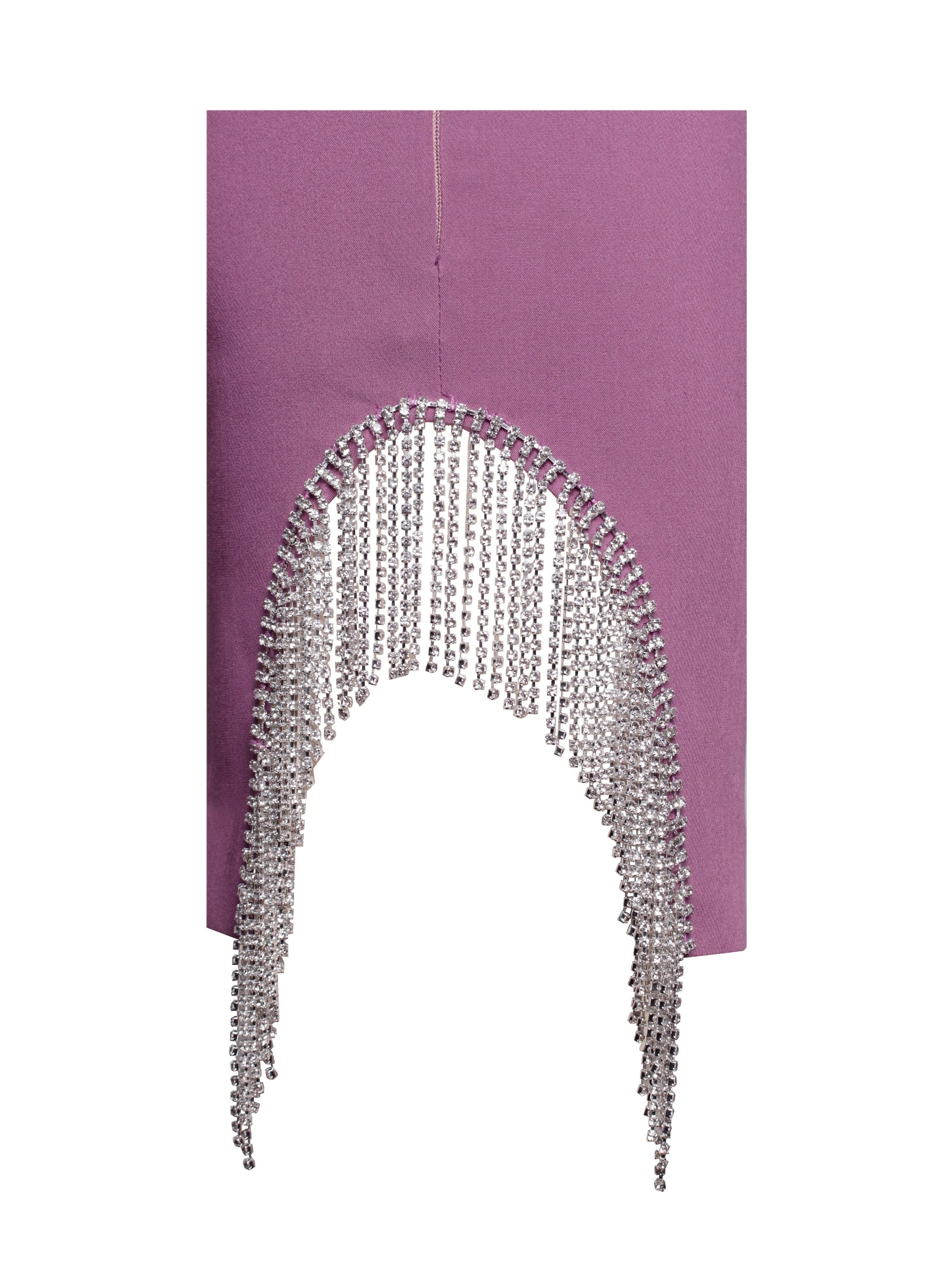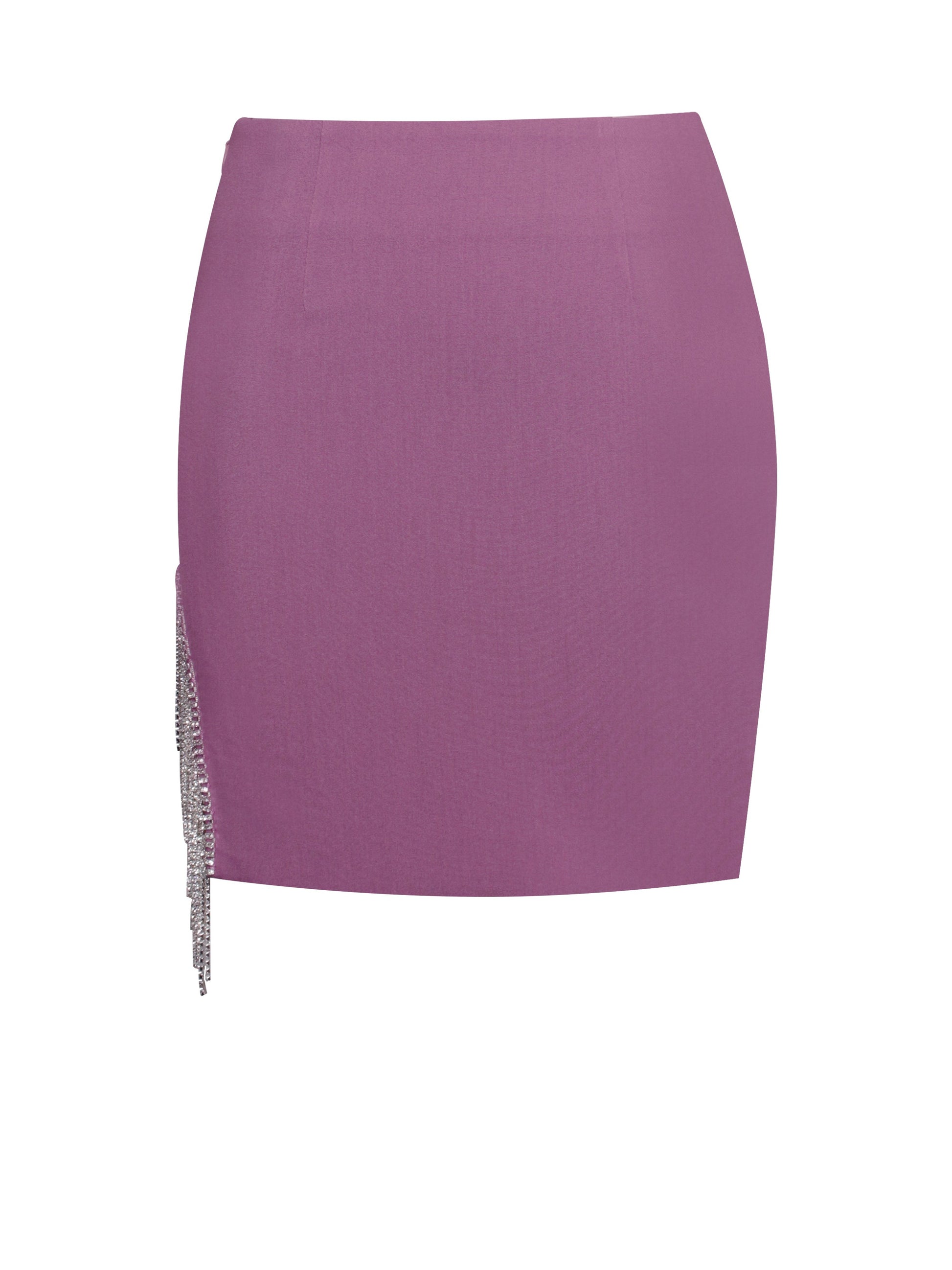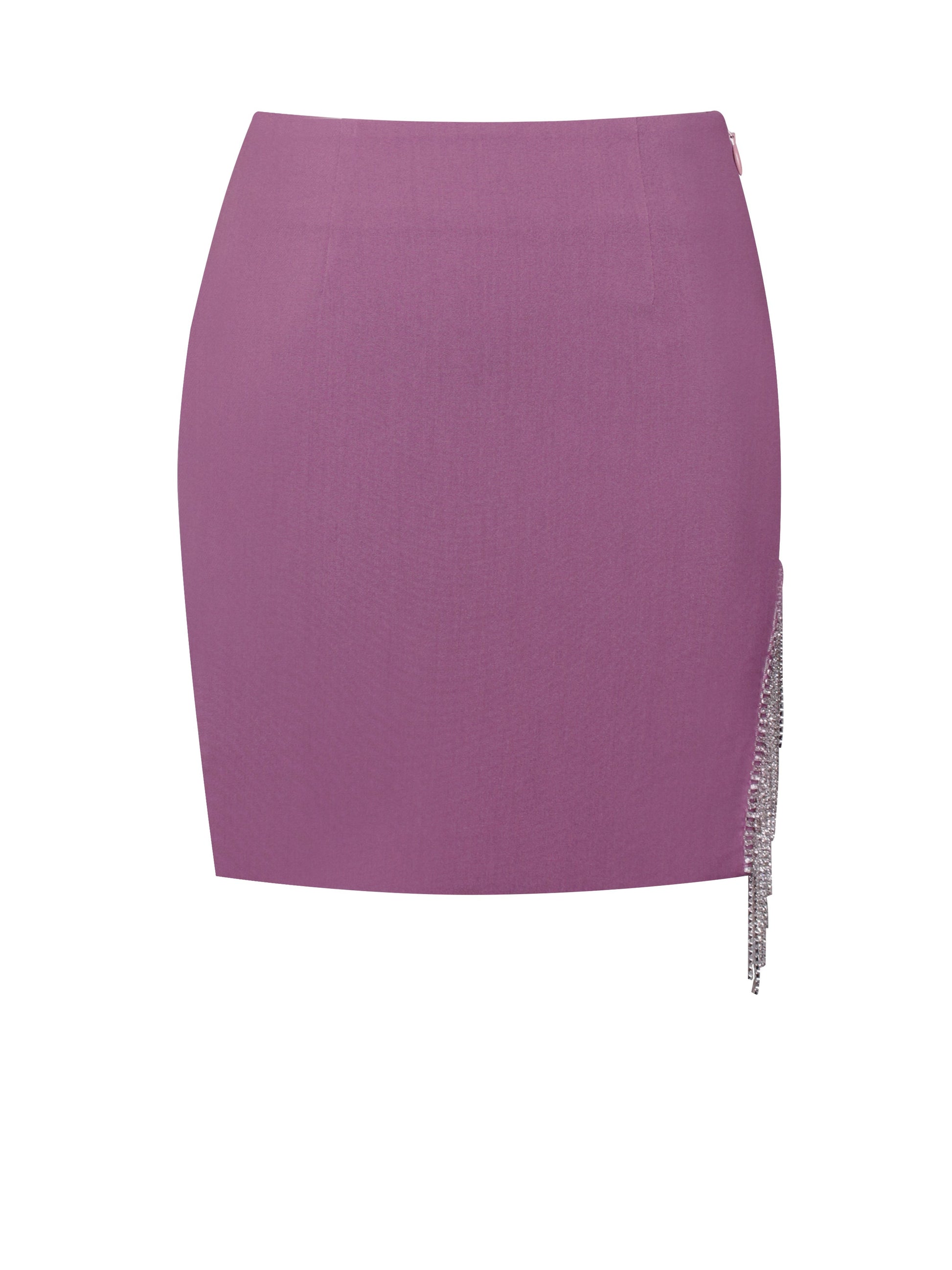 Enhance your style with the Tate Mauve Crystal Fringe Mini Skirt, boasting a length of approximately 15 inches (38cm). Crafted from woven fabric, this skirt offers low stretch and is designed to complement your figure. The model, standing at 5'11" and wearing a Size XS (US-2), brings the ensemble to life. Care for the skirt with dry-clean only treatment. Please note that color variations may occur due to lighting in images, but the product images without the model are the most accurate representation of the item's color.