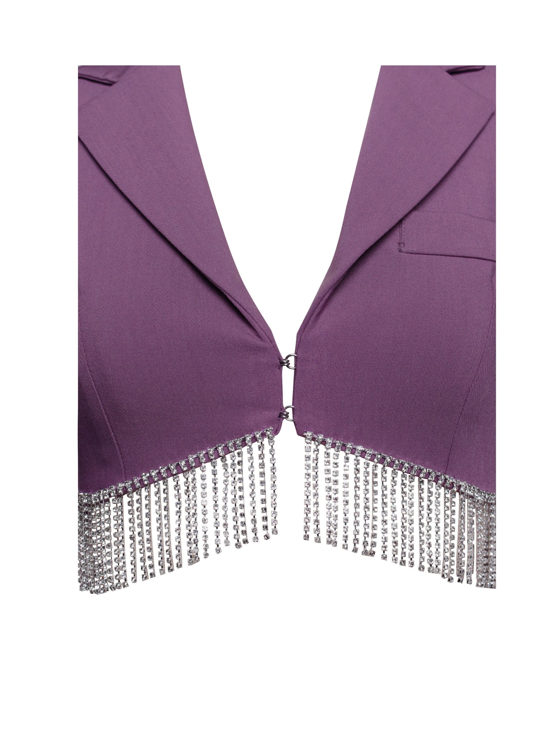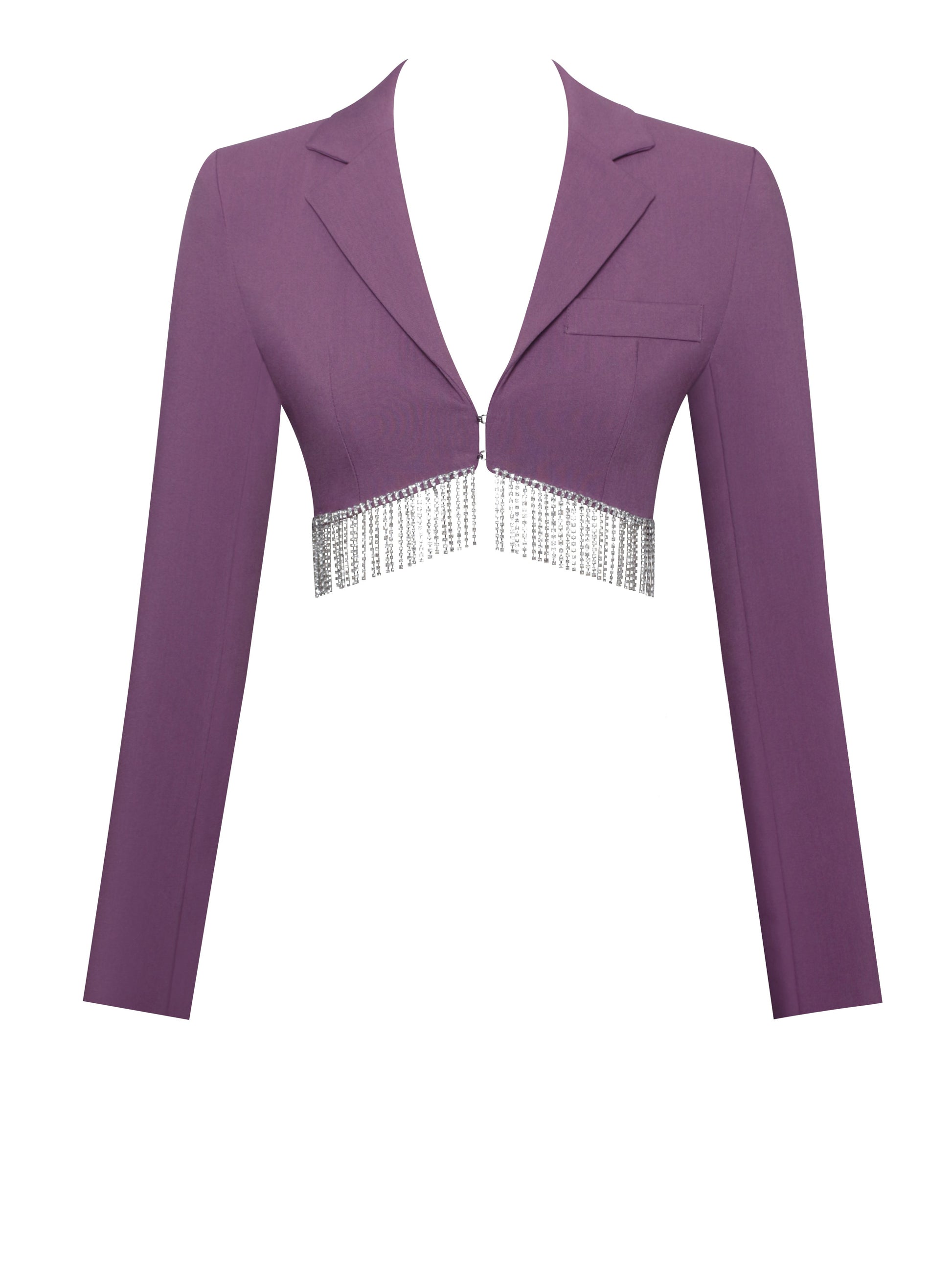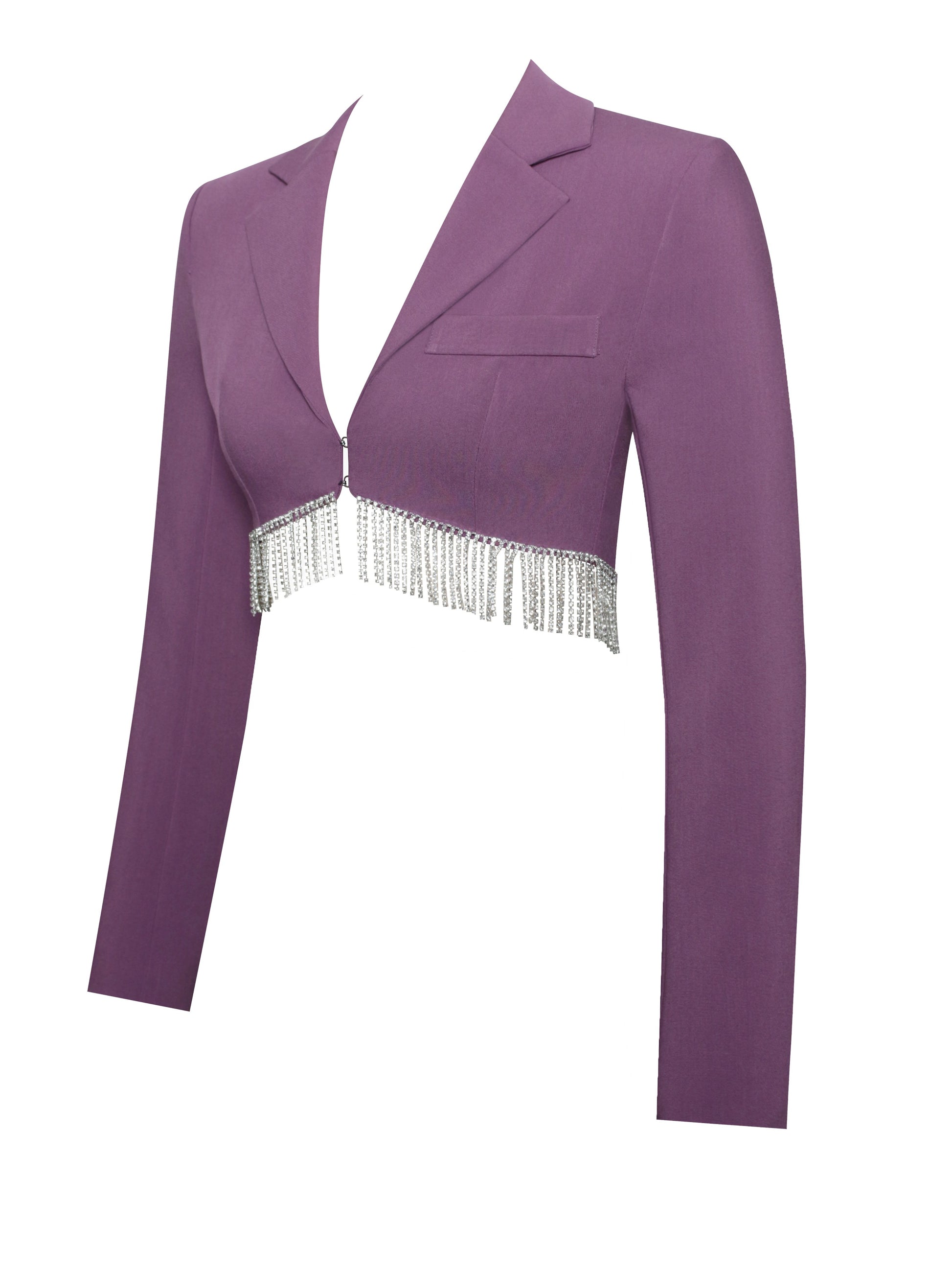 Teagan Mauve Crystal Fringe Blazer Crop Top. This top also features woven fabric construction, with a length of about 16.5 inches (42cm) and low stretch for a tailored fit. The model's height of 5'11" and Size XS (US-2) contribute to the chic appearance. Maintaining the top's elegance is as easy as dry-cleaning only. Keep in mind that color differences might arise from image lighting, but the product images excluding the model offer the closest color portrayal.
